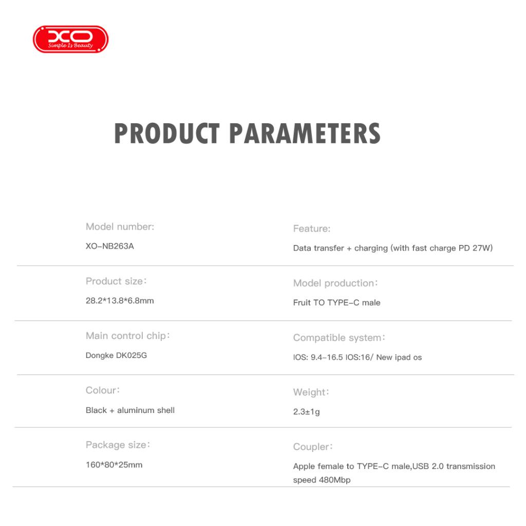 Προσαρμογέας Type-C σε Lightning XO NB263Α. Επιτρέπει τη φόρτιση και τη μετάδοση δεδομένων. Συμβατό με συσκευές που διαθέτουν υποδοχή USB-C. Πλέον μπορείτε να χρησιμοποιείτε τα παλιά καλώδια Lightning για να φορτίζετε σύγχρονες συσκευές USB-C από smartphones μέχρι κάθε είδους αξεσουάρ, με ισχύ έως και 27W.