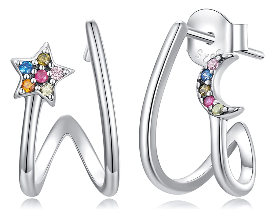 Εντυπωσιακά σκουλαρίκια με διπλό κρίκο Bamoer κατασκευασμένα από ασήμι 925, διακοσμημένα με σχέδιο αστέρι και ημισέληνος, με χρωματιστή κυβική ζιρκόνια.
