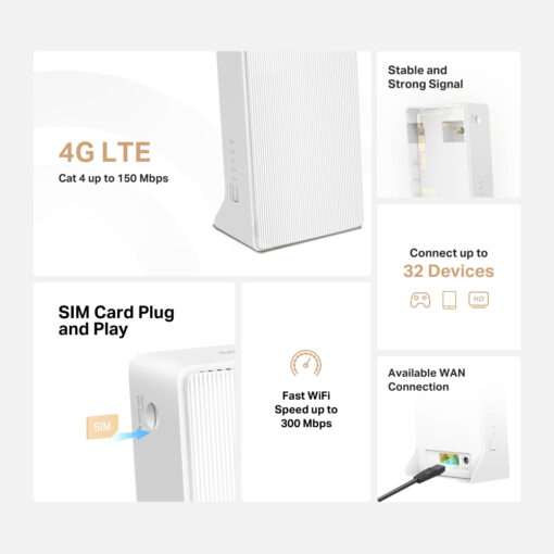Το 4G router από την Mercusys σας επιτρέπει να μοιράζεστε μέσω κάρτας SIM, ασύρματο δίκτυο κινητής τηλεφωνίας 4G σε έως 32 συσκευές, με ταχύτητα έως 300 Mbps.