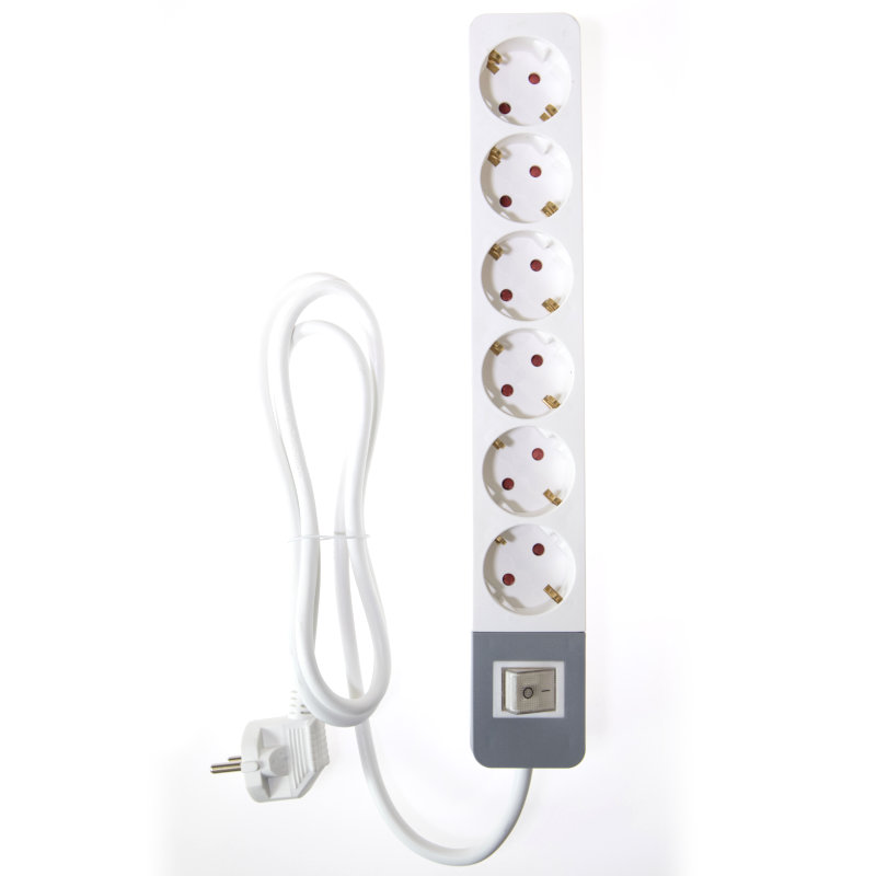 Πολύπριζο με φωτιζόμενο διακόπτη 6 θέσεων. Αποτελείται από 6 πρίζες σούκο σε γωνία 45 μοιρών για να μην εμποδίζει η μια πρίζα την άλλη. Όλες οι πρίζες του πολύπριζου διαθέτουν παιδική προστασία και η ηλεκτρική παροχή σε αυτές μπορεί να απενεργοποιηθεί εύκολα από τον φωτιζόμενο κεντρικό διακόπτη.